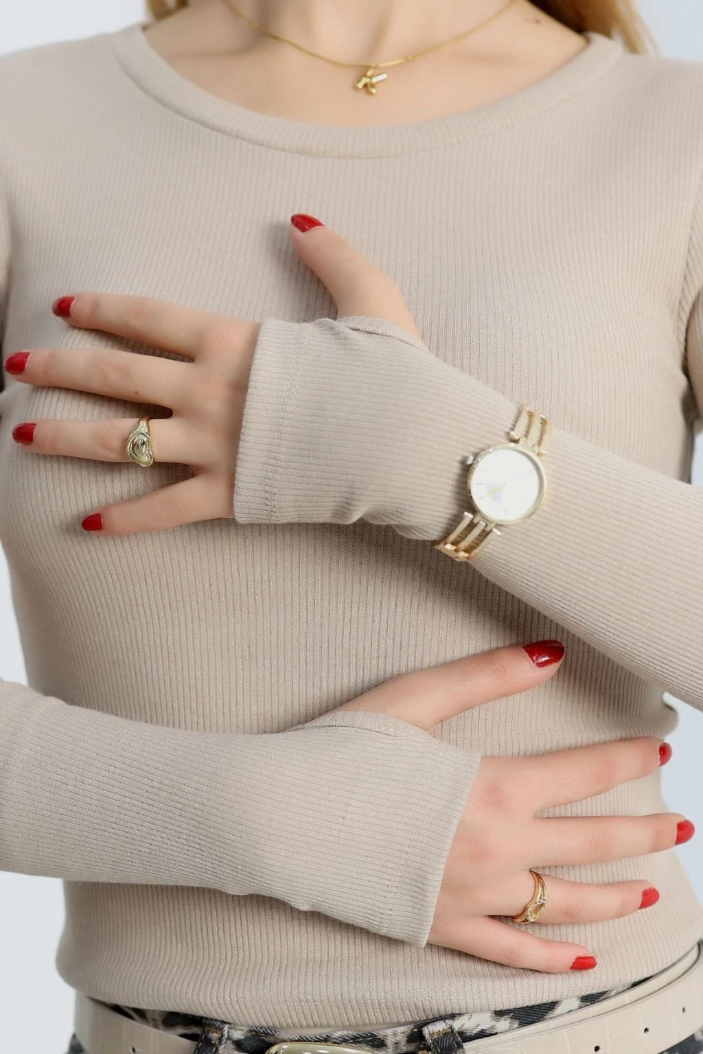 Bisiklet Yaka Parmak Geçmeli Kaşkorse bluz bej a3829