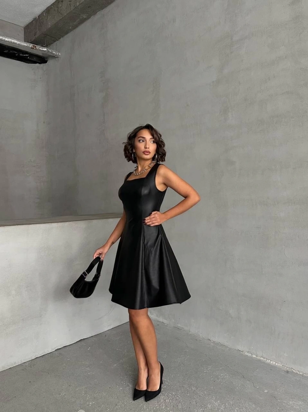• Kare yaka deri elbise siyah h24442