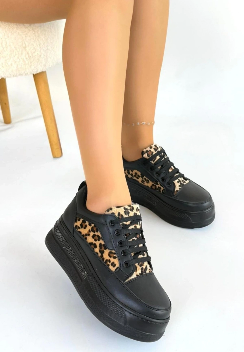 • Lorrin Siyah Cilt Leopar Detaylı Bağcıklı Spor Ayakkabı