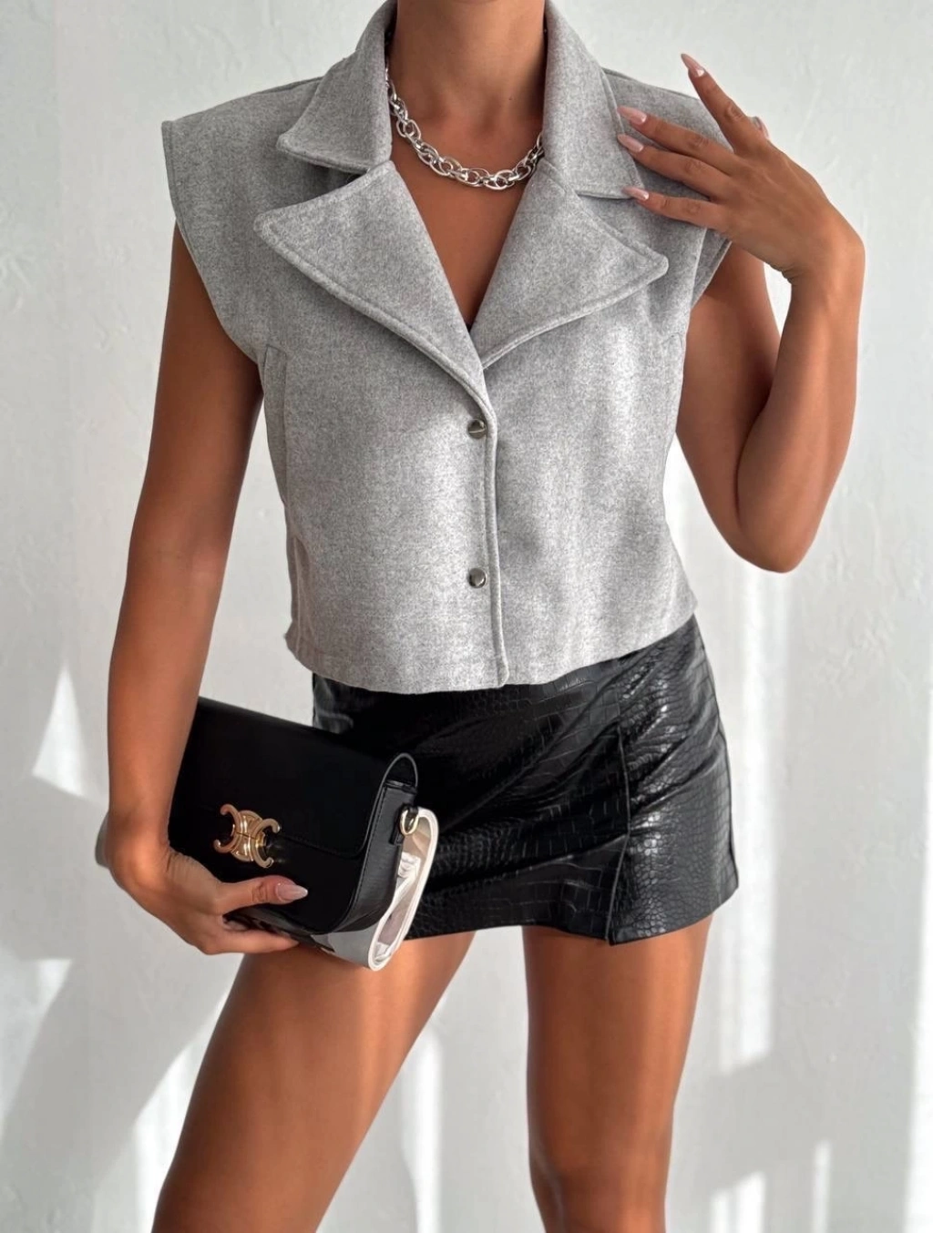 Önü çıtçıtlı cepli kaşe yelek gri F2253, şıklığı ve kullanışlılığı bir arada sunar.