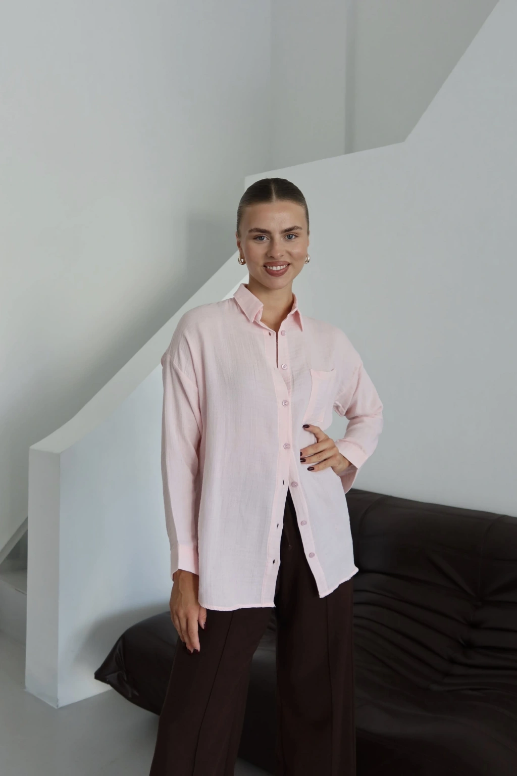 Şıklığı ve rahatlığı bir arada sunan Tek Cep Detaylı Müslin Gömlek, gardırobunuzun vazgeçilmez parçalarından biri olmaya aday!