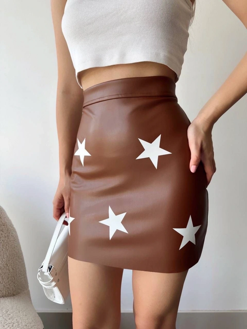 Bu şık ve trend yıldız baskılı deri etek, gardırobunuza yıldızı bir parça ekleyecek! Modern ve şık tasarımıyla her kombini mükemmel bir şekilde tamamlayacak.